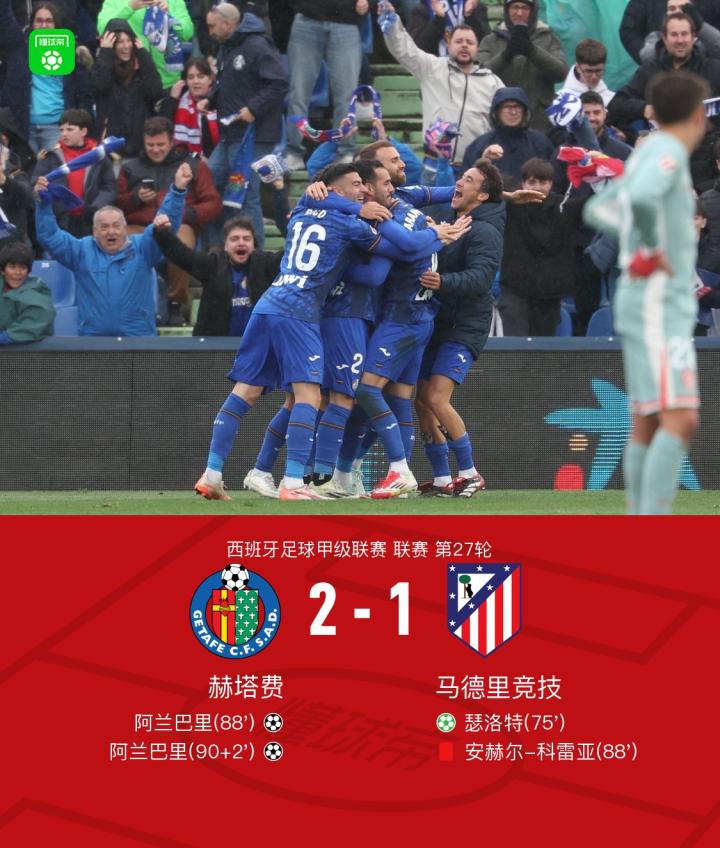 比分紧张胶着时刻,赫塔费士气高涨,球员们充满斗志地在场上拼搏。随着比赛进入伤停补时阶段,阿兰巴里再次挺身而出,连续在第90+2分钟和第90+6分钟两度破门,帮助赫塔费逆转比分,最终2-1战胜马德里竞技。全场比赛掀起了赛场的狂热气氛,球迷们沸腾地欢呼雀跃,庆祝着这场来之不易的胜利。